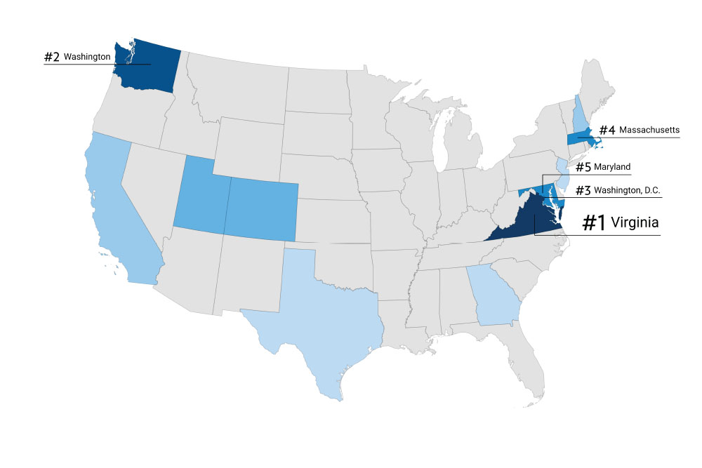 Virginia offers tech firms access to the highest concentration of tech talent and the third largest tech industry workforce in the nation, with 315,000 people working in the tech sector and/or tech occupations. Virginia’s Mid-Atlantic location facilitates talent attraction from the entire eastern seaboard and beyond.